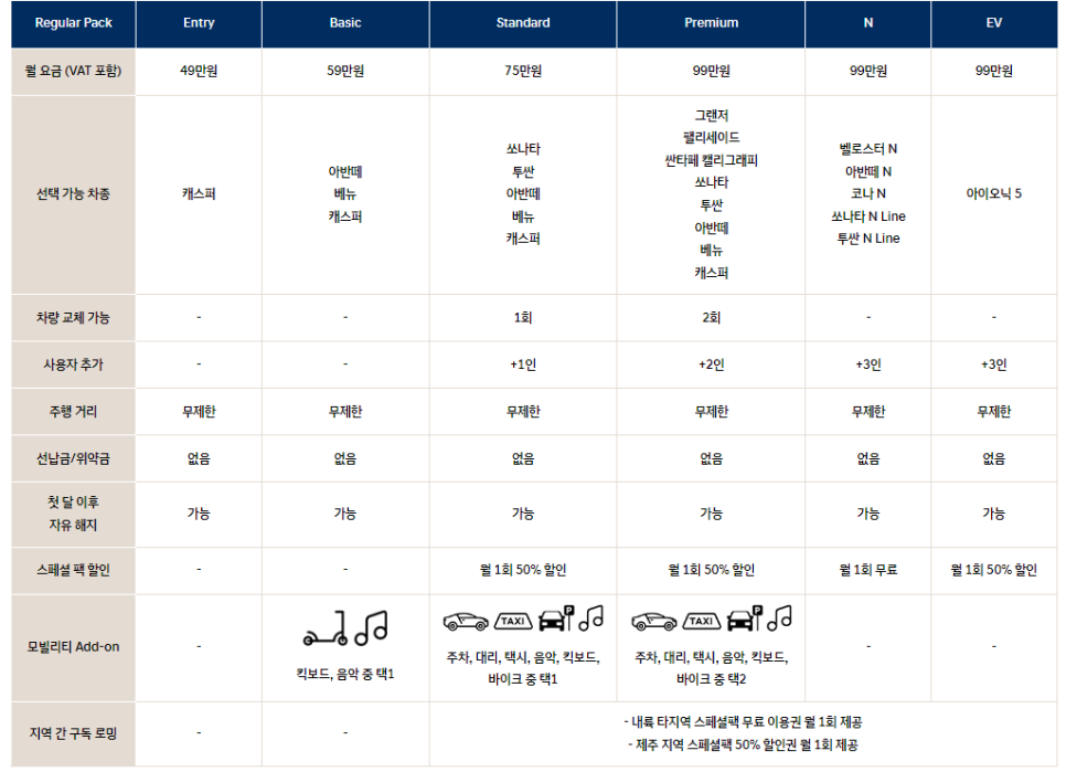 장기렌트나 리스상품과 달리 운행거리(마일리지) 제한이 없어 부담 없이 이용할 수 있고, 비교적 장기간 동안 한 가지 모델만 이용해야 하는 장기렌트나 리스상품이 부담스러웠던 소비자들에게 매력적인 서비스가 될 것으로 기대됩니다.