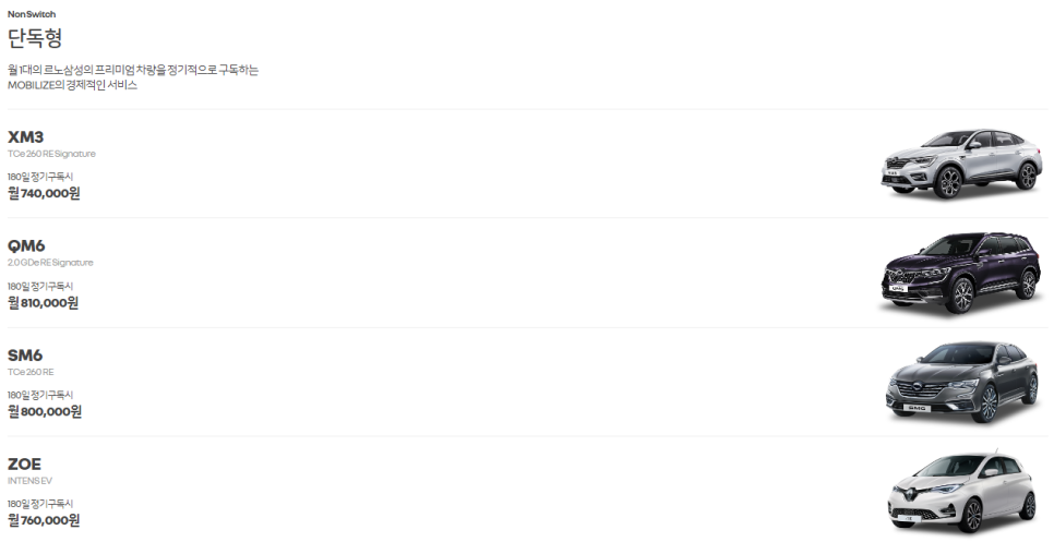 모빌라이즈 구독서비스는 르노삼성(XM3·SM6·QM6) 및 르노 브랜드 모델(조에) 중 1개의 모델을 월 단위로 이용할 수 있는 단독형 상품과 2가지 모델을 이용할 수 있는 교체형 상품으로 구성돼 있습니다.