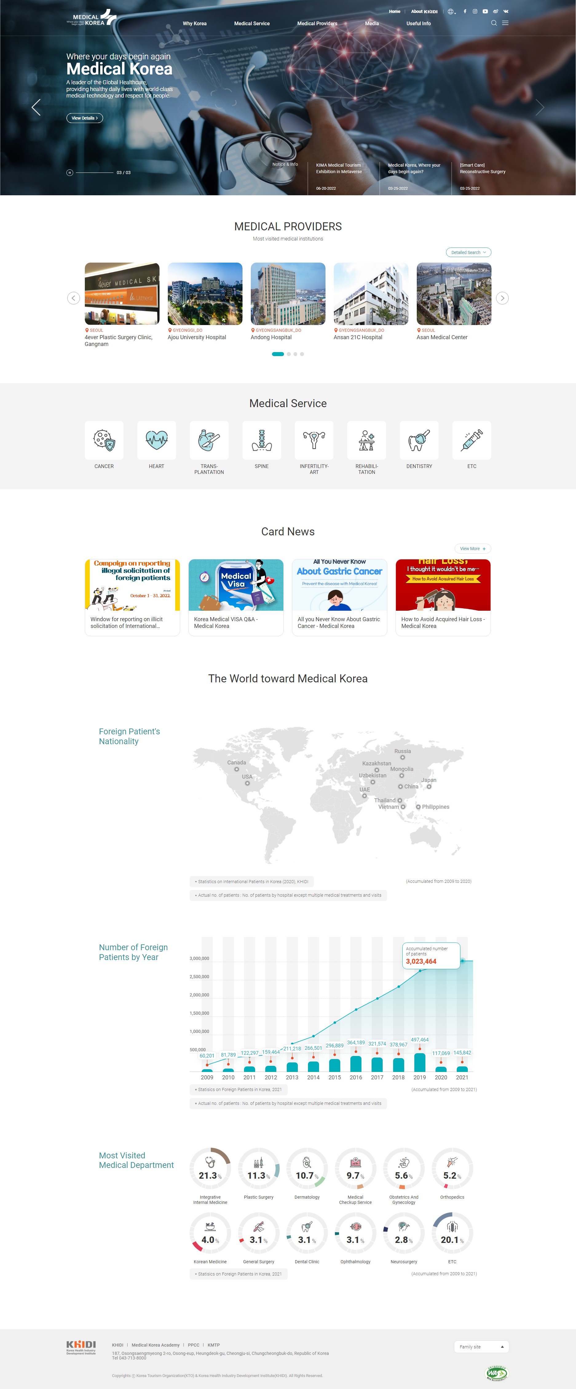 관련 통계수치 및 일상생활 건강 가이드 등을 시각화된 자료로 제공하여 이용자가 쉽고 빠르게 정보에 접근할 수 있는데요. 한국 의료서비스 이용시 필요한 모든 정보를 메디컬코리아 홈페이지 내에서 통합 제공하고 있습니다.