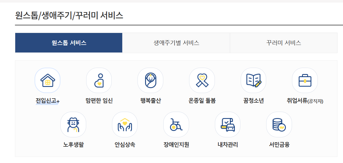 맘편한 임신, 행복출산, 온종일 돌봄, 꿈청소년, 전입신고+, 안심상속 서비스를 한 번에 통합 신청 처리할 수 있는 서비스를 제공합니다.