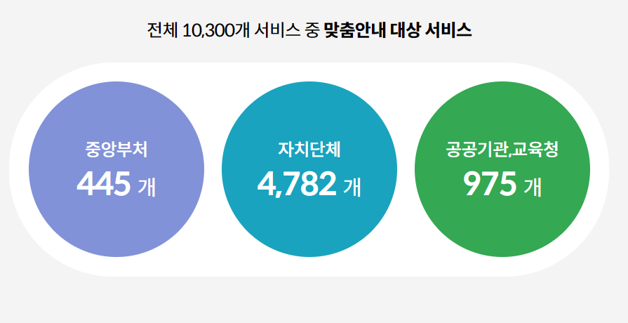 - 맞춤안내 대상 5,800여 개의 서비스 중 정부24에서 온라인 신청이 가능한 서비스는 1,000 여 개입니다. 서비스별 안내 정보 중 신청방법이 '바로 신청하기'로 안내되는 서비스입니다.