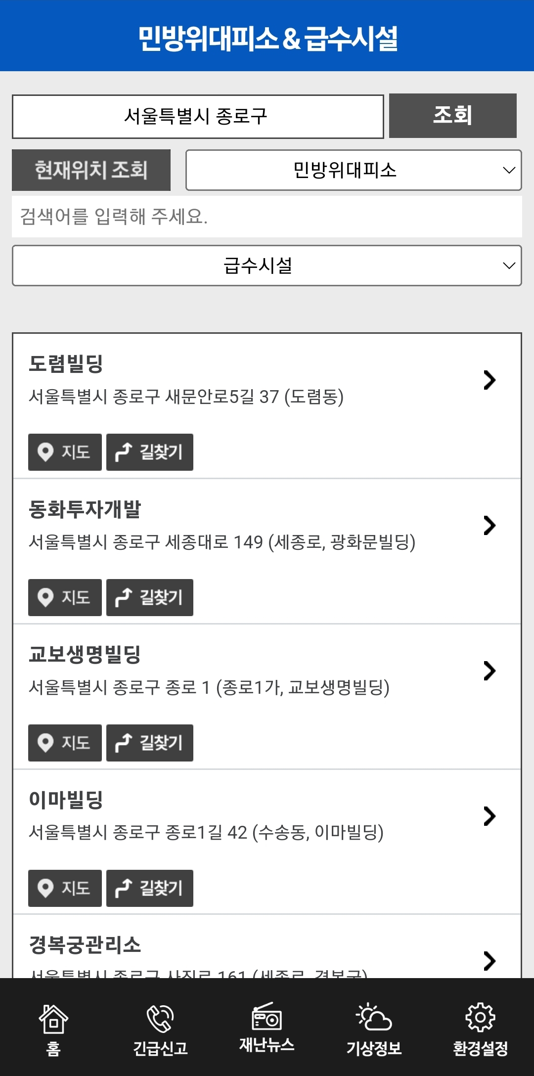 - 민방위 대피소, 이재민 주거시설, 응급의료센터 등 시설물 정보를 확인