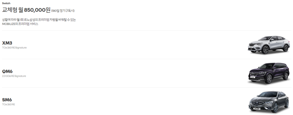 모빌라이즈 구독서비스는 르노삼성(XM3·SM6·QM6) 및 르노 브랜드 모델(조에) 중 1개의 모델을 월 단위로 이용할 수 있는 단독형 상품과 2가지 모델을 이용할 수 있는 교체형 상품으로 구성돼 있습니다.