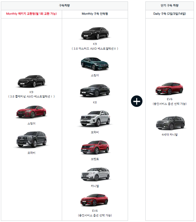 장기렌트나 리스상품과 달리 운행거리(마일리지) 제한이 없어 부담 없이 이용할 수 있고, 비교적 장기간 동안 한 가지 모델만 이용해야 하는 장기렌트나 리스상품이 부담스러웠던 소비자들에게 매력적인 서비스가 될 것으로 기대됩니다.